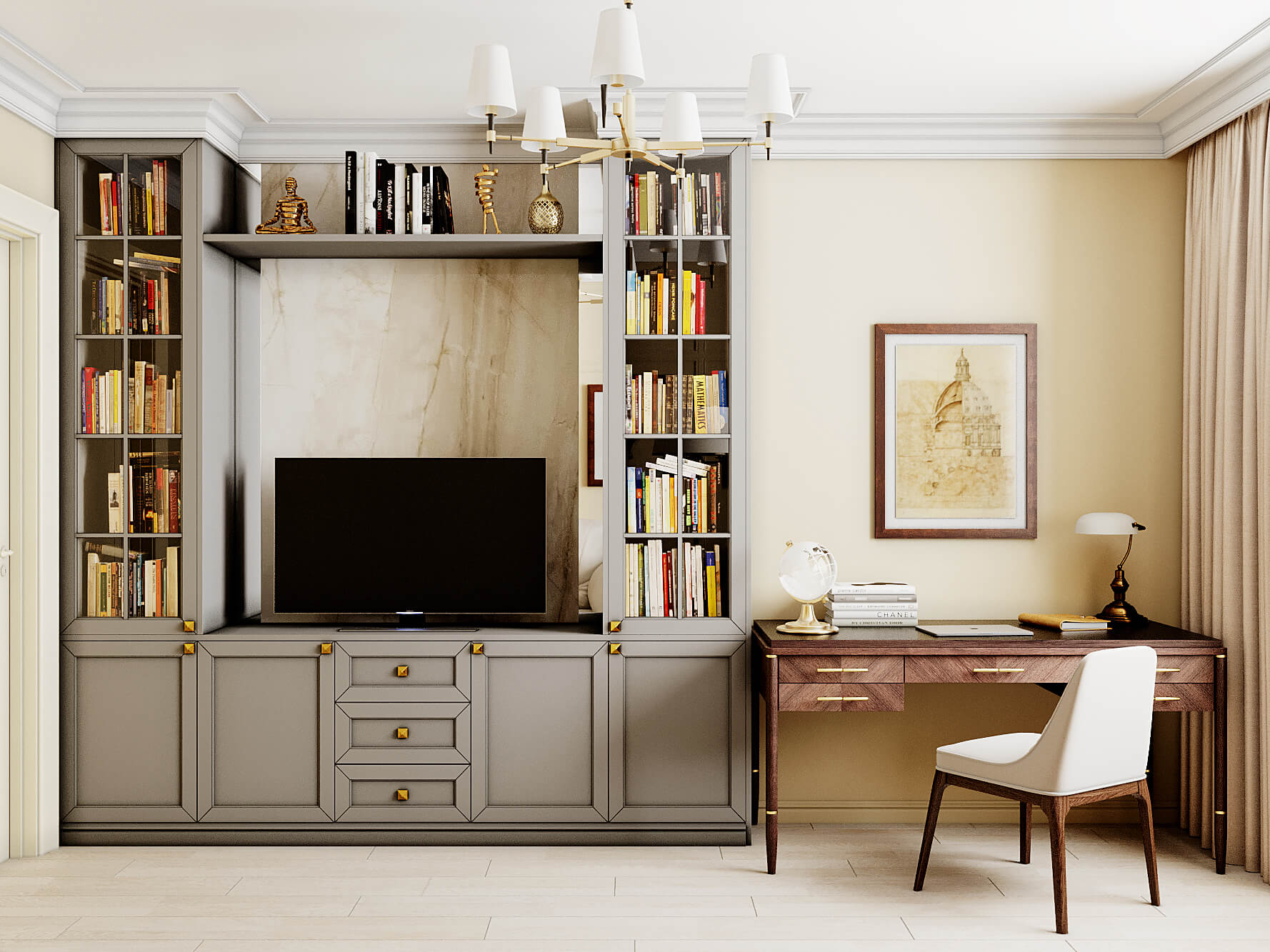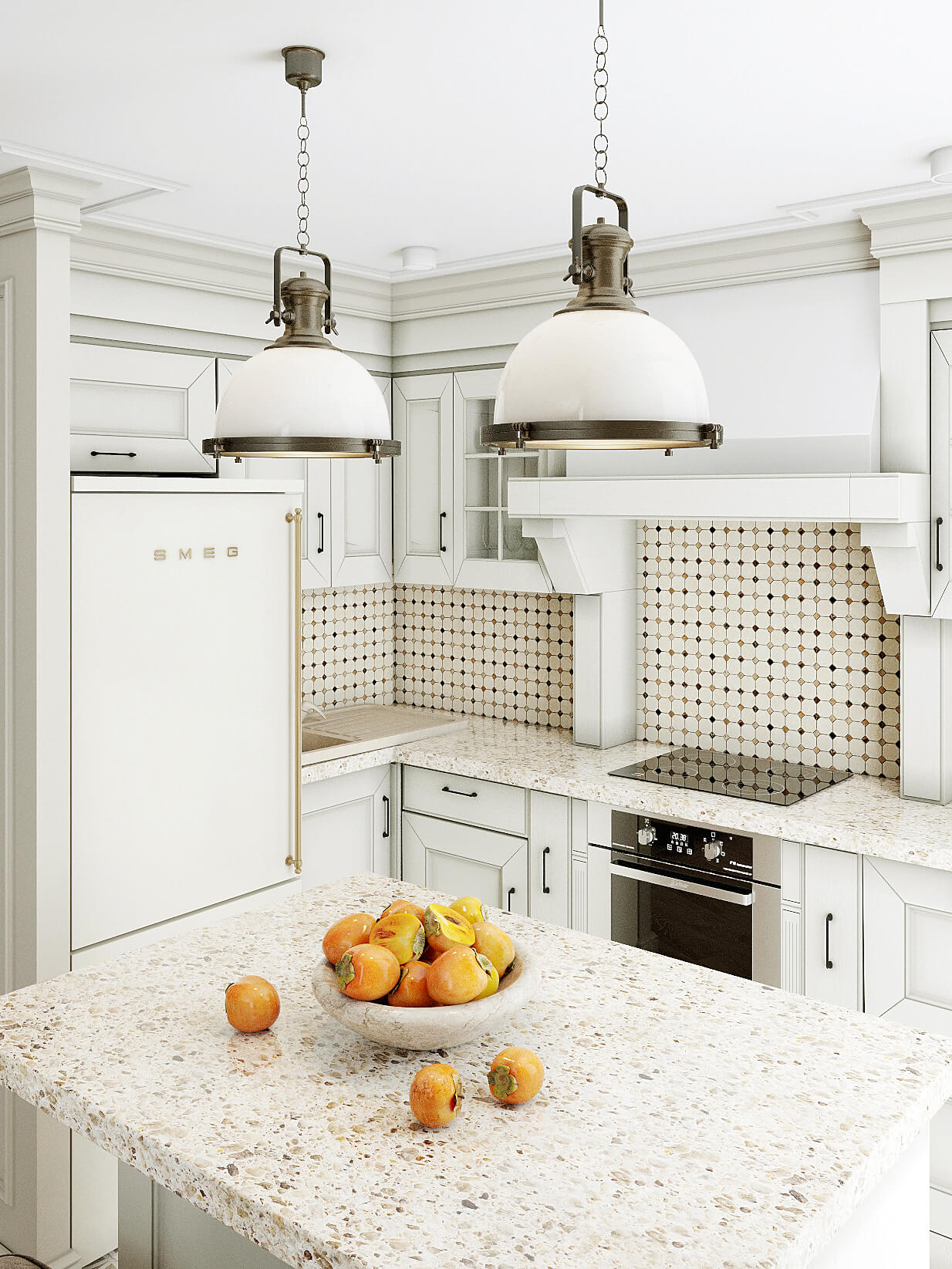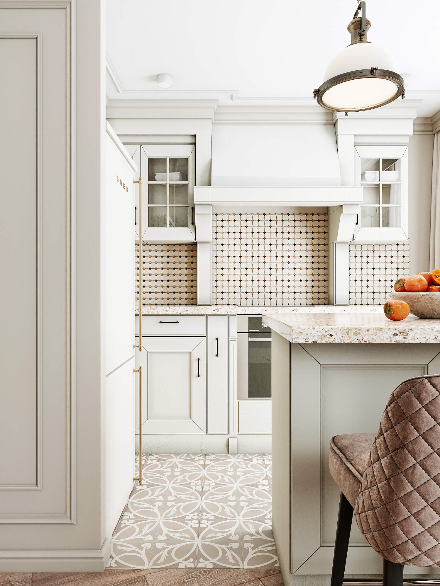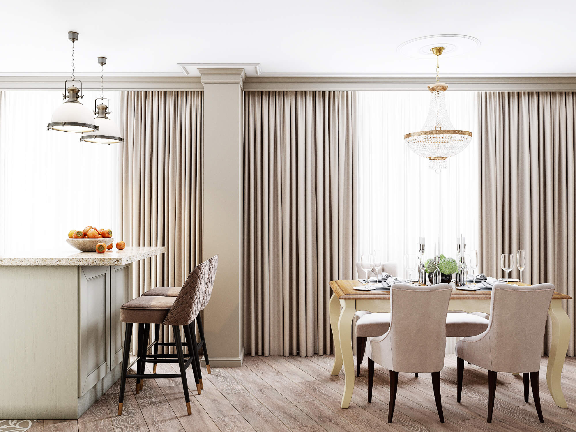 Задача: обьединить кухню и гостиную, светлый интерьер в классическом стиле. Использовать существующую мебель: кухонный гарнитур, диван и кресла.