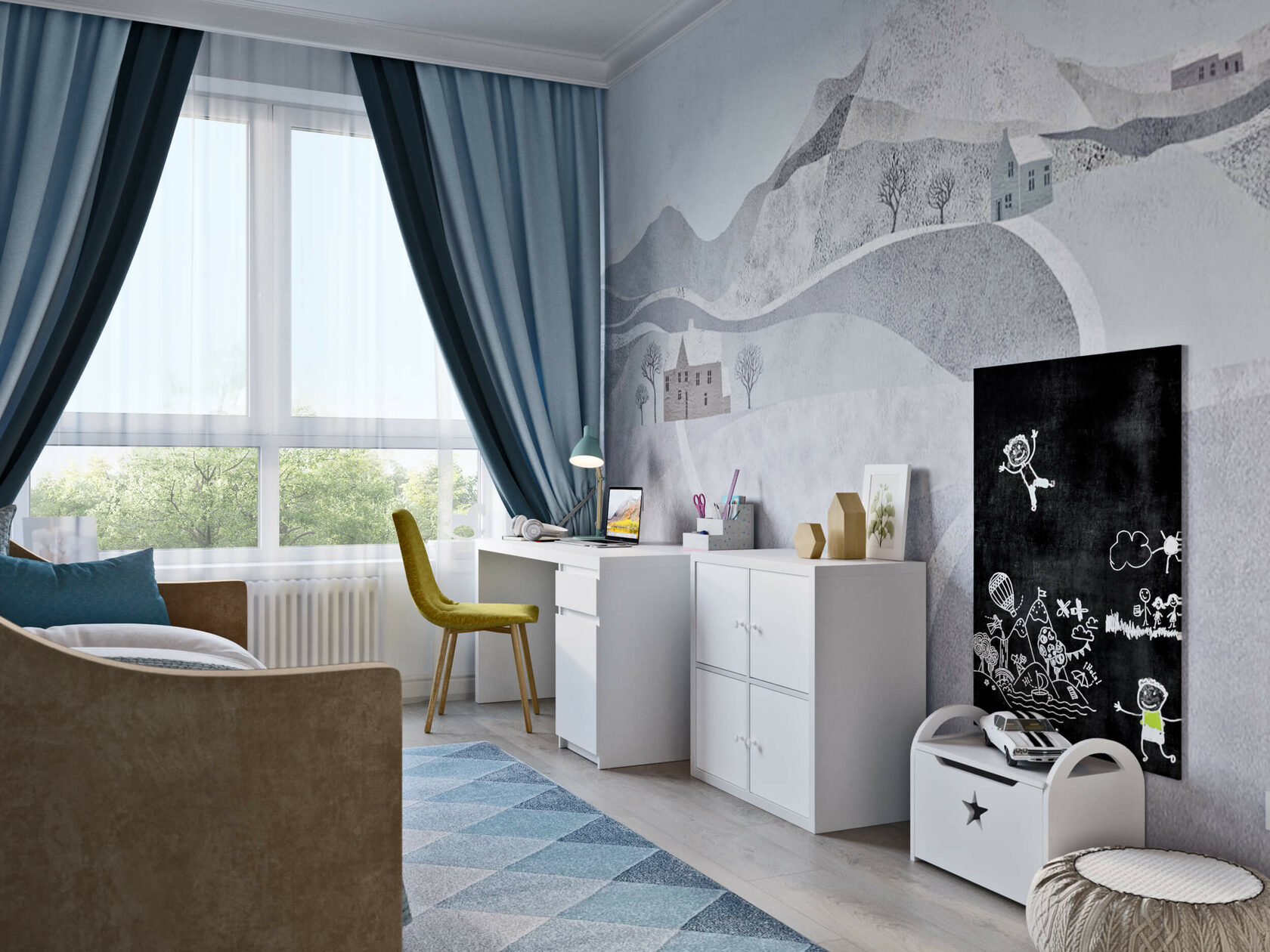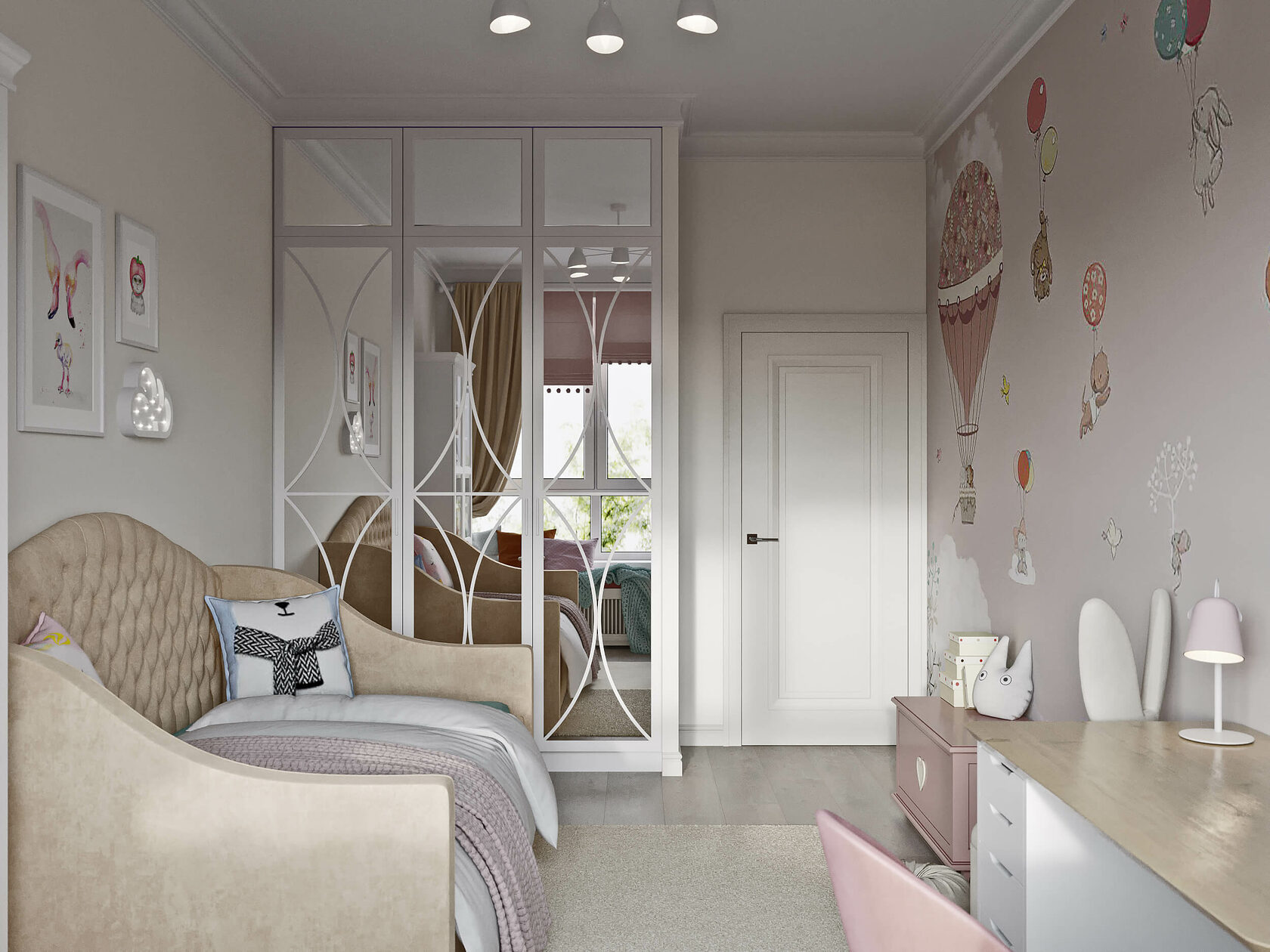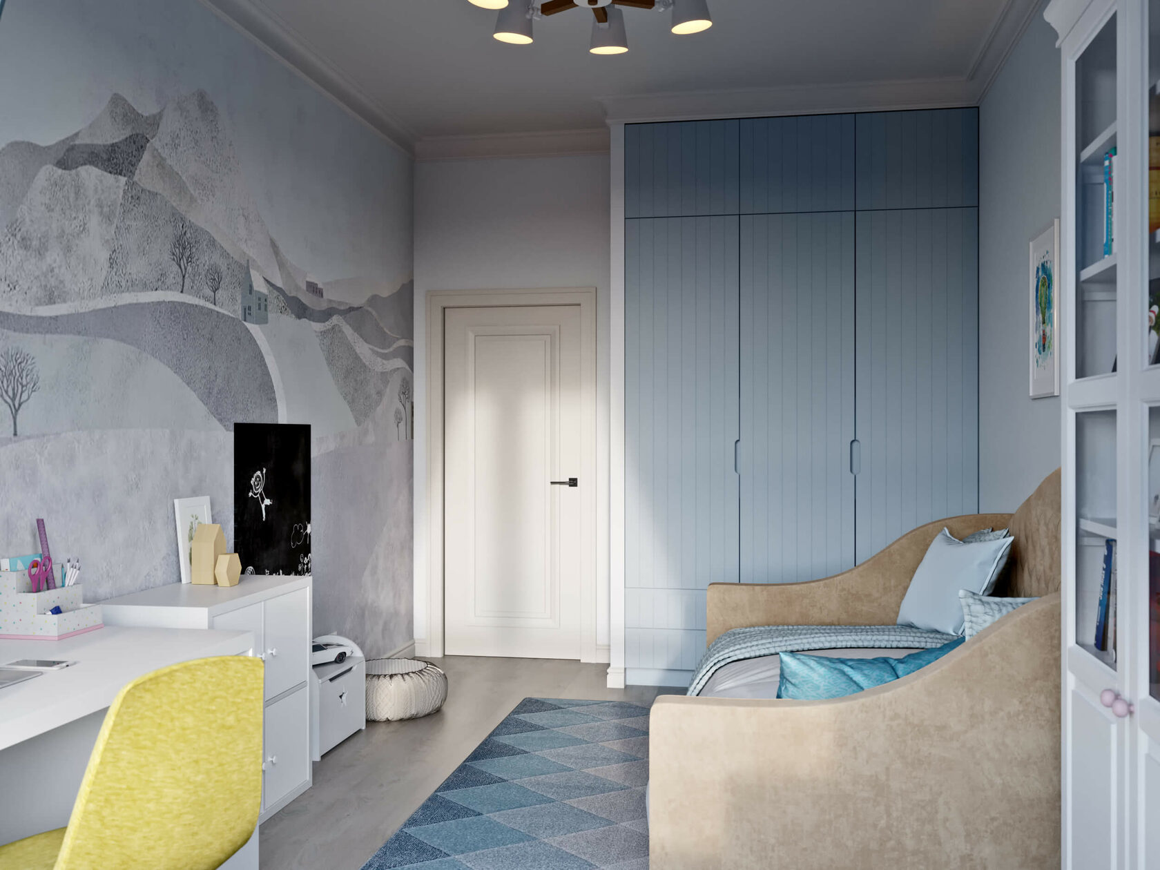 Задача: объединение двух квартир в одну. Минимальная площадь на коридор и холл, максимум свободного пространства. Концепция двух детских комнат должна совпадать, разница только в оттенках.