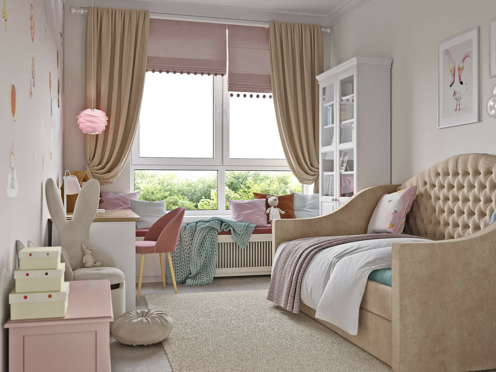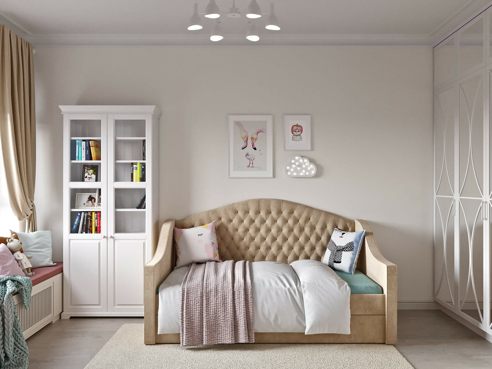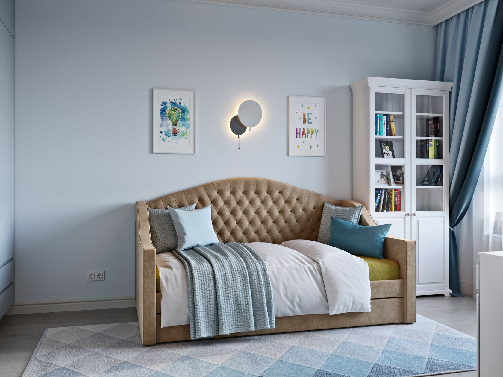 Задача: объединение двух квартир в одну. Минимальная площадь на коридор и холл, максимум свободного пространства. Концепция двух детских комнат должна совпадать, разница только в оттенках.