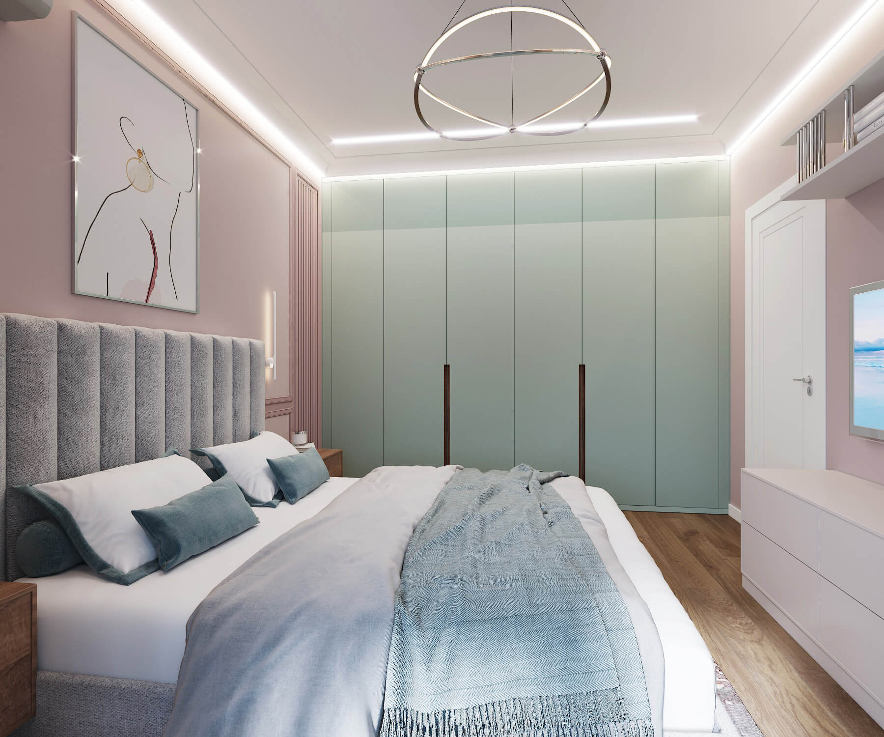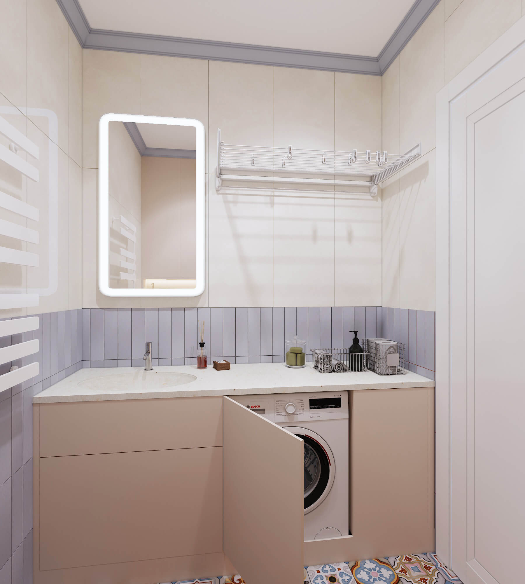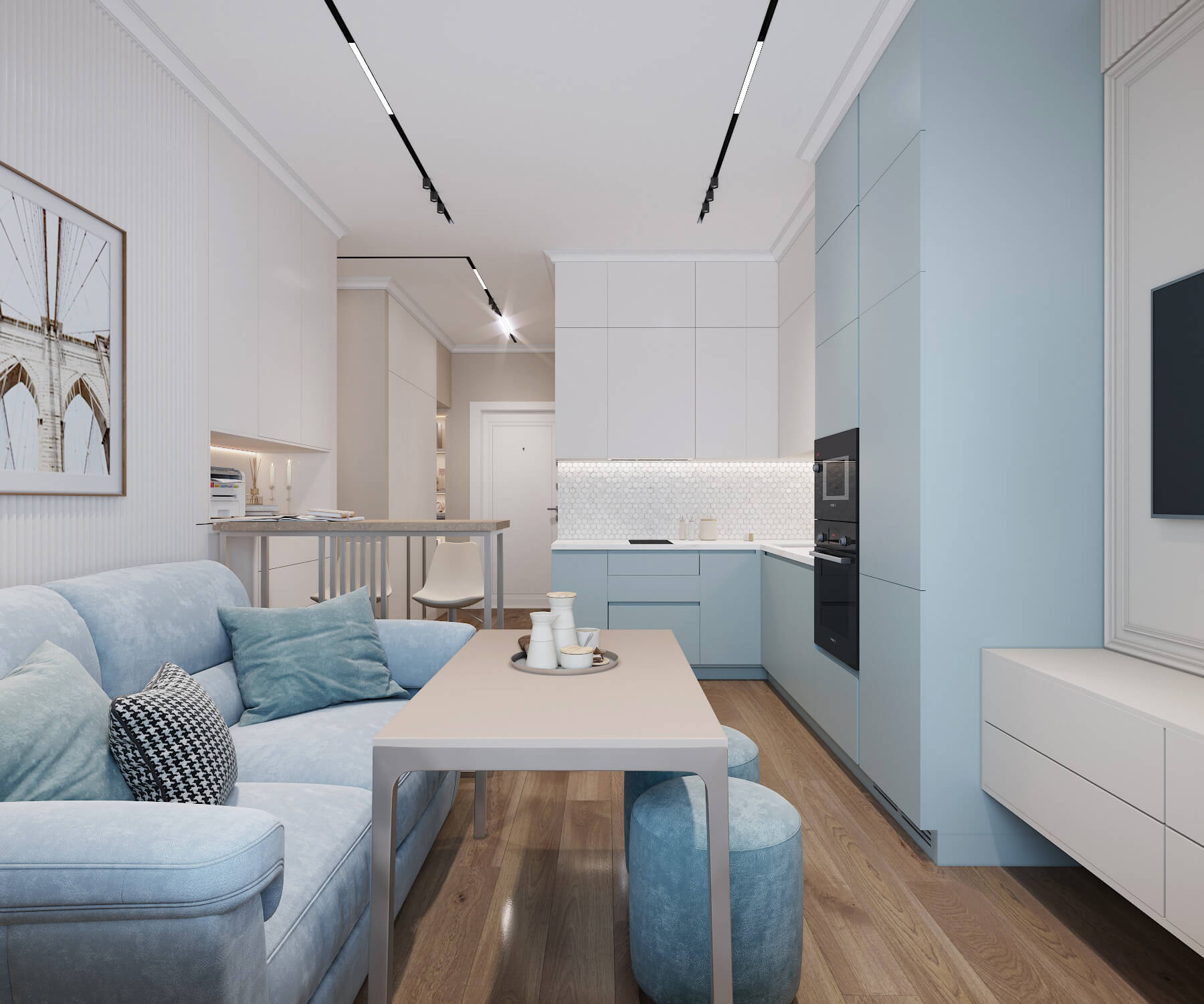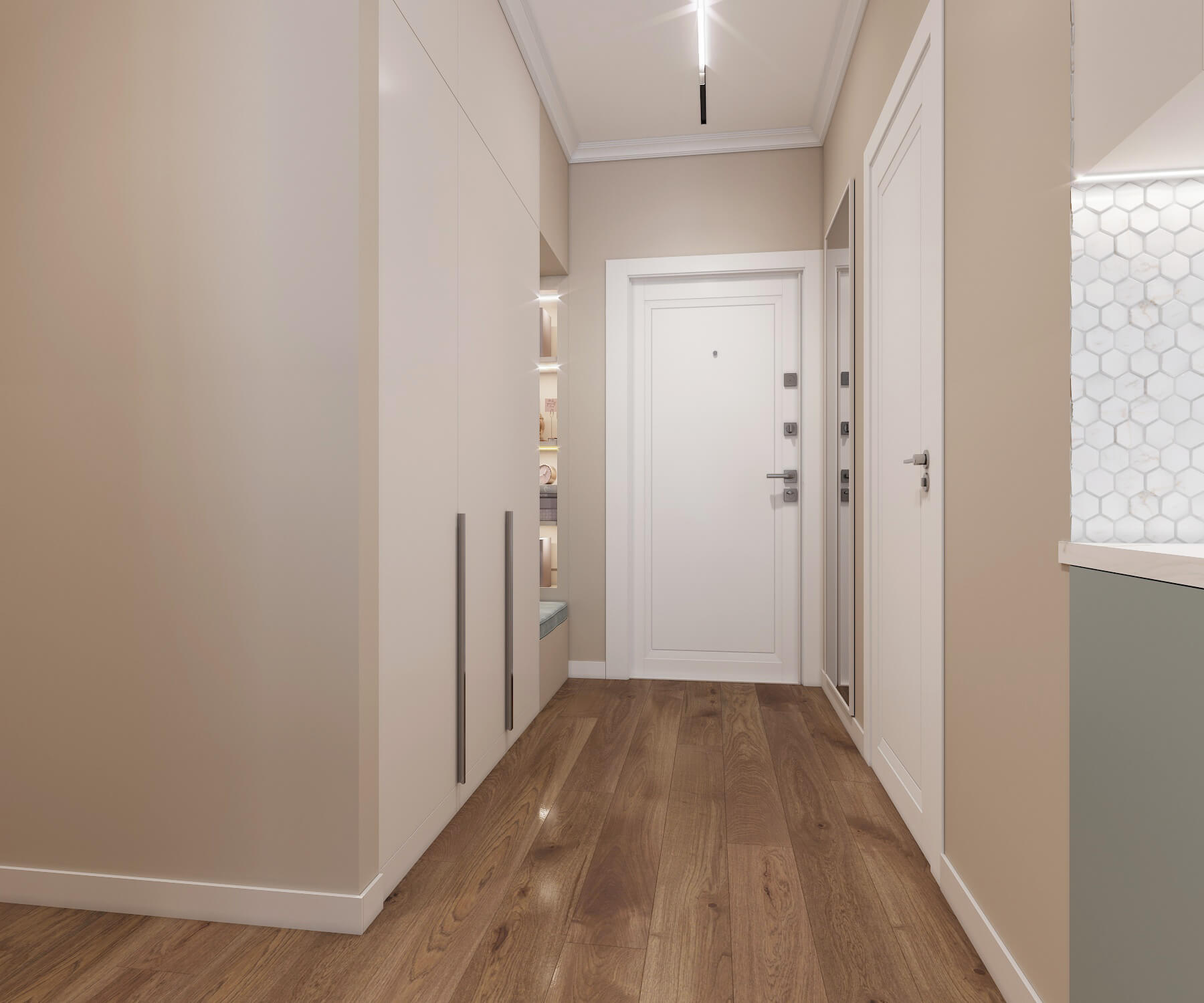 Факты: начали работу над проектом до получения ключей, так как застройщик предоставил планировку со всеми размерами. Дизайн согласовали до замеров, а чертежи выполнили — после. После замера размеры изменились не значительно, что не отразилось на дизайне.