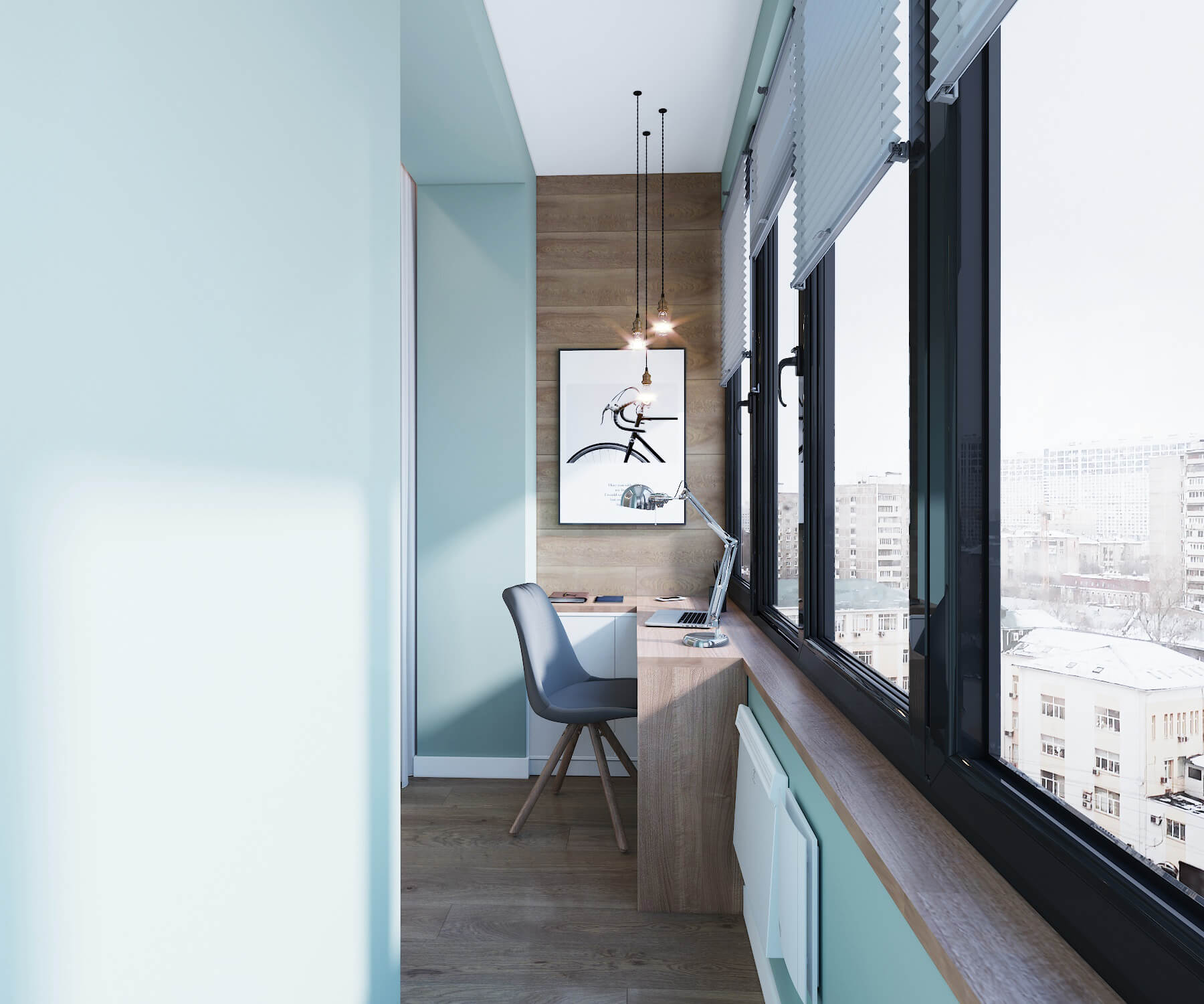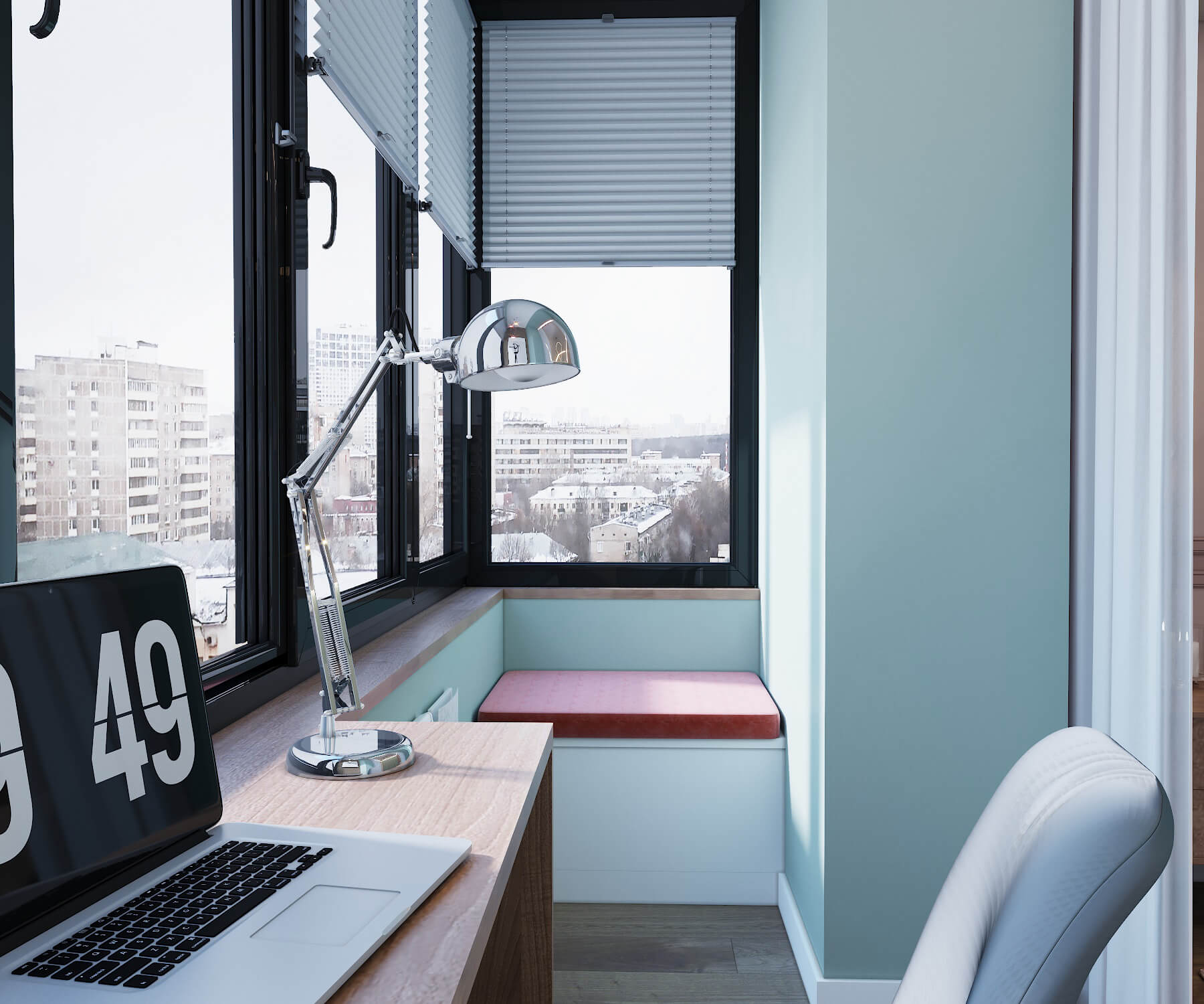 Задача: задействовать каждый квадратный метр, организовать 2 рабочих места в разных помещениях, цветовая гамма спокойная, приглушенная с яркими акцентами сложных оттенков.