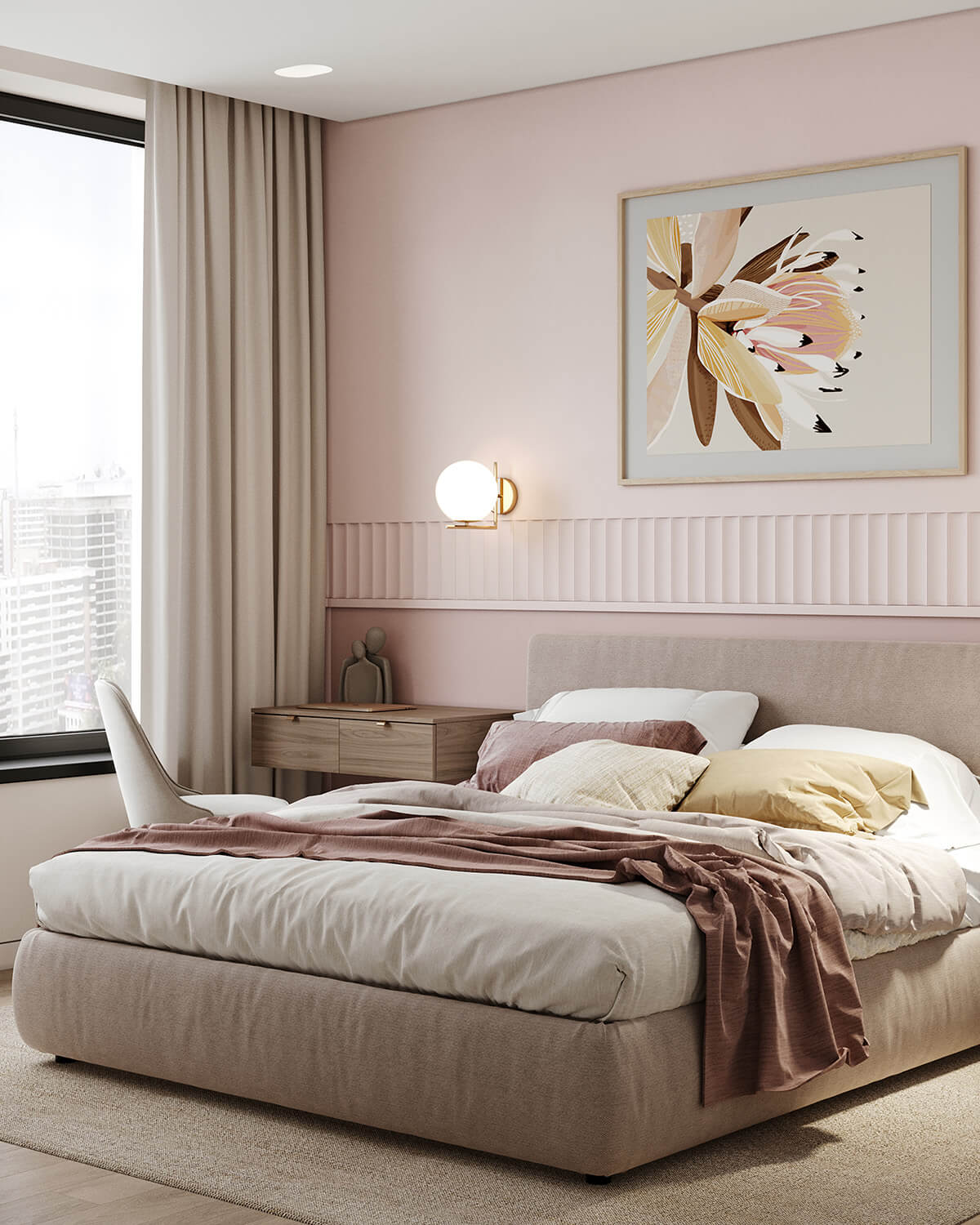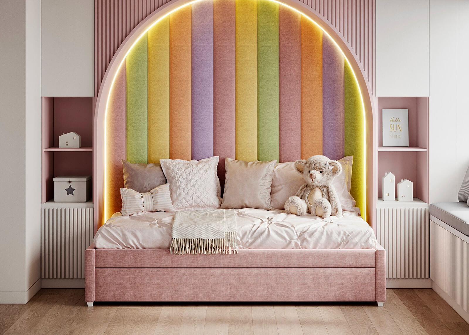 Задача: создать теплый, светлый, спокойный, лаконичный интерьер, не перегруженный декором. Использовать в интерьере натуральное дерево. В детской комнате отразить идею радуги.